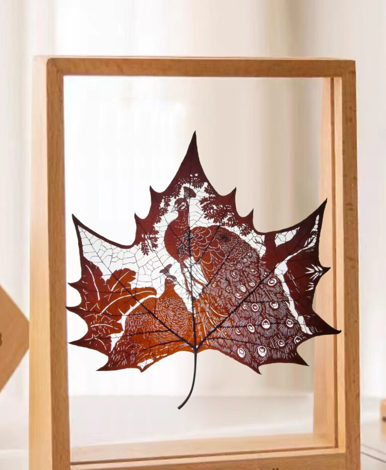 Created using traditional Chinese leaf-carving techniques, recognized as an intangible cultural heritage art form.