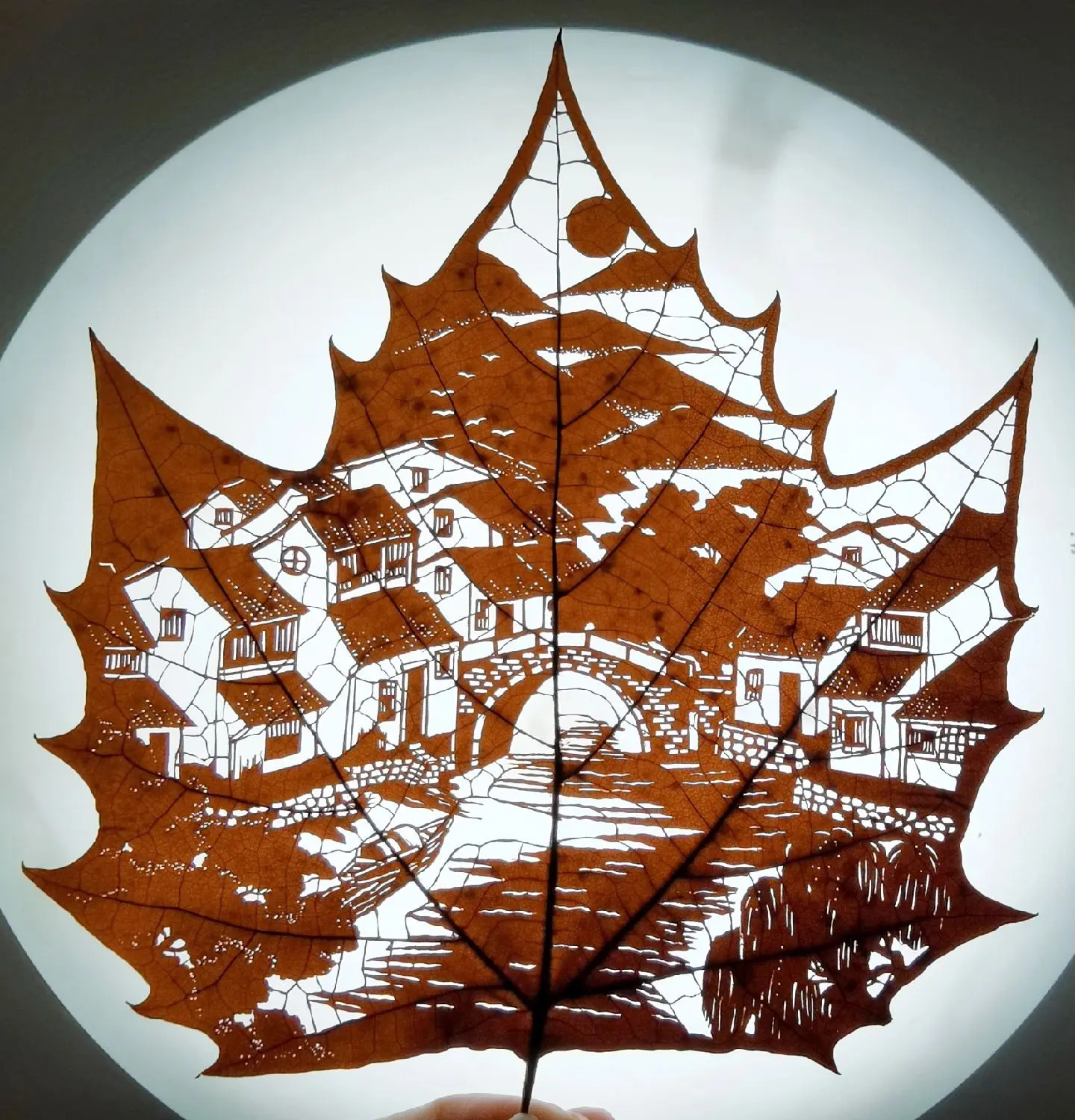 This traditional hand-carved maple leaf art piece, named ‘Ancient Villages and Bridges’, captures the timeless charm of traditional rural life. Every building, every bridge, and every path is intricately carved onto natural maple leaves with exquisite craftsmanship, symbolizing the beautiful harmony between humans and nature. This artwork brings a sense of tranquility and nostalgia to your space, serving as a perfect example of the seamless fusion of modern craftsmanship and ancient beauty.
